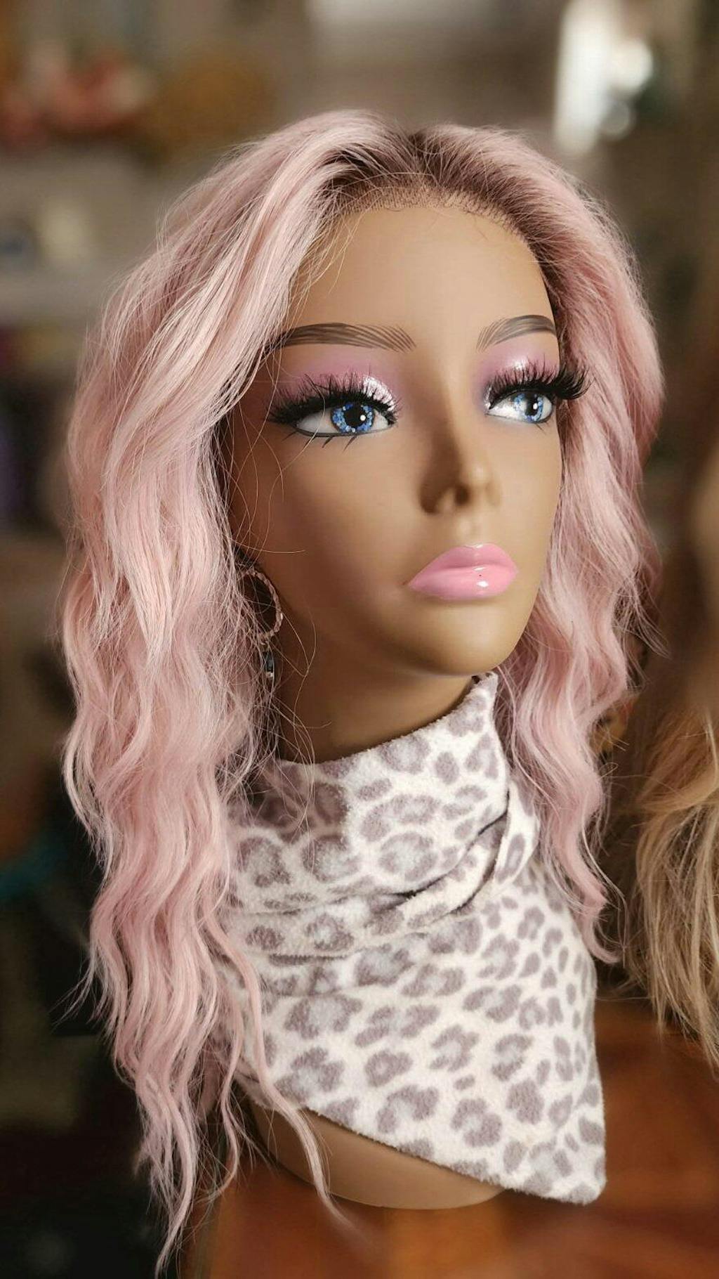 Photos are taken in different lighting to show how the wig color changes under various lighting conditions.